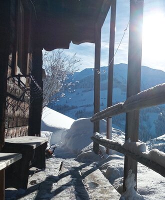 Unsere Hütte liegt inmitten einer Bergwiese oberhalb von unserem Hof. Abseits vom üblichen Wintertourismus findet ihr hier Ruhe und Erholung.