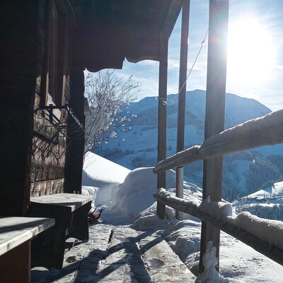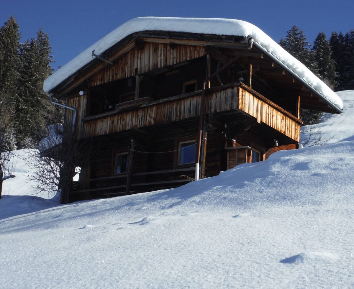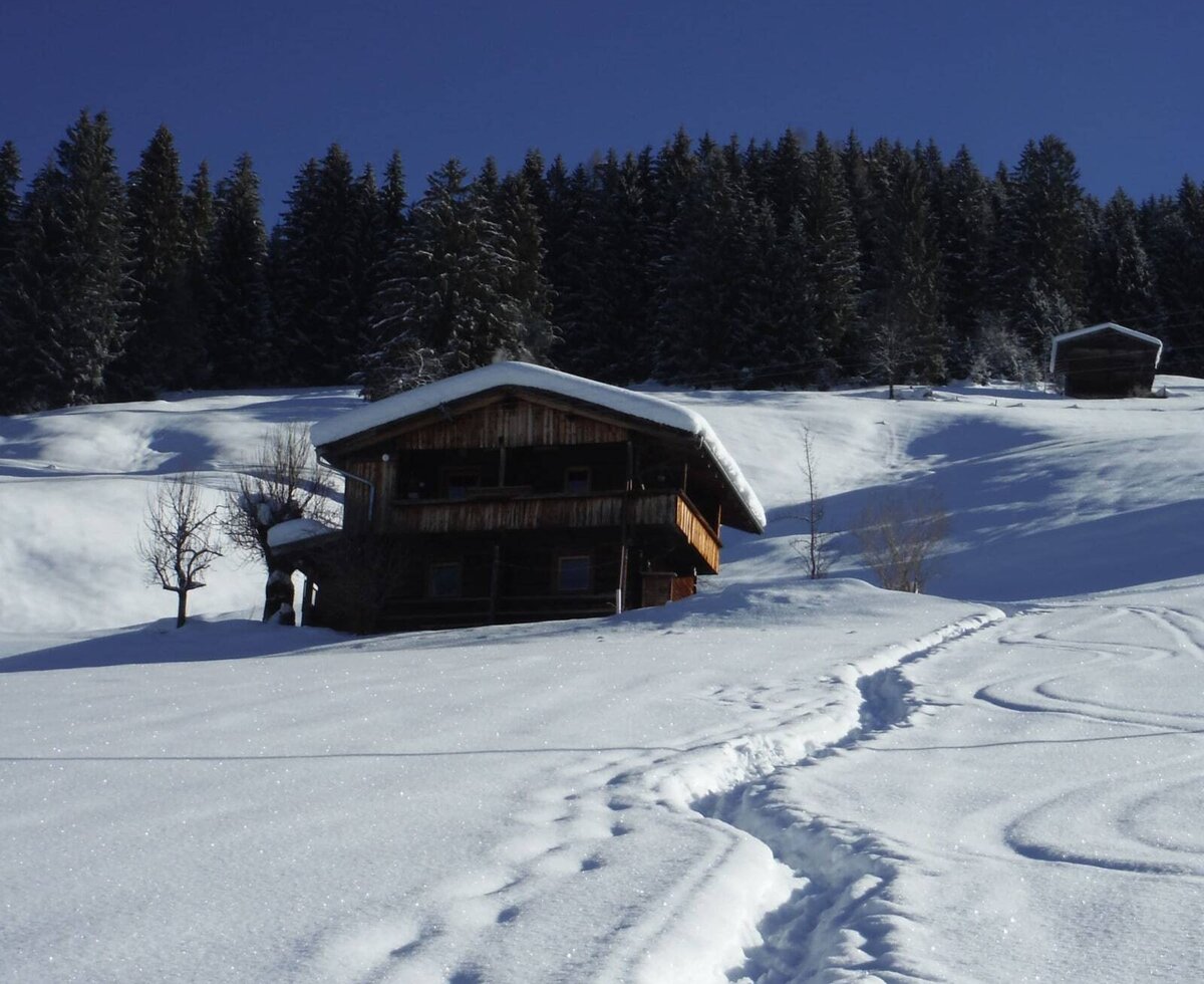 Unsere Hütte liegt inmitten einer Bergwiese oberhalb von unserem Hof. Abseits vom üblichen Wintertourismus findet ihr hier Ruhe und Erholung.