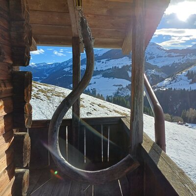 Bei der Hütte angekommen, kann man die Aussicht auf die umliegenden Berge genießen. Die Terasse lädt zum Grillen und gemütlichen Beisammensein ein.