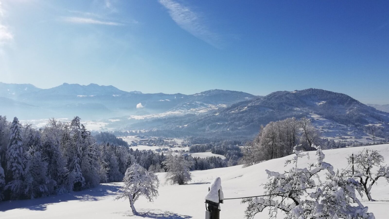Wenn der Schnee die Landschaft rund um Langenegg in glitzerndes Weiß hüllt, verwandelt sich das Haus Blickfang in einen Ort voller Ruhe, Gemütlichkeit und unvergesslicher Wintermomente. Der Blick über die verschneiten Hügel des Bregenzerwaldes – einfach magisch.