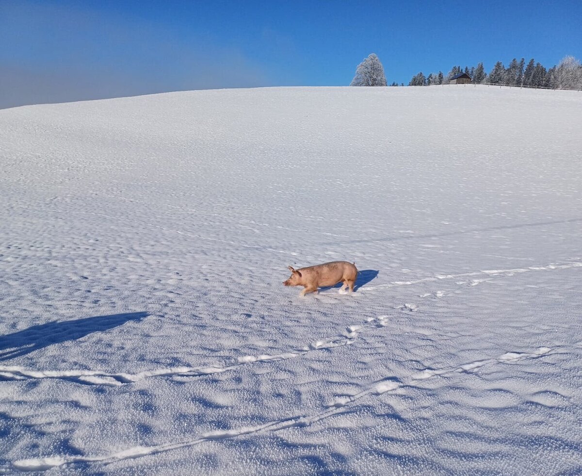 Am Hof erwarten Sie unsere neugierige Ziege Franzi, freilaufende Schweine, Rinder, verspielte Kälbchen und der verschmuste Kater Jimmyjango – jedes Tier mit seinem ganz eigenen Charakter.