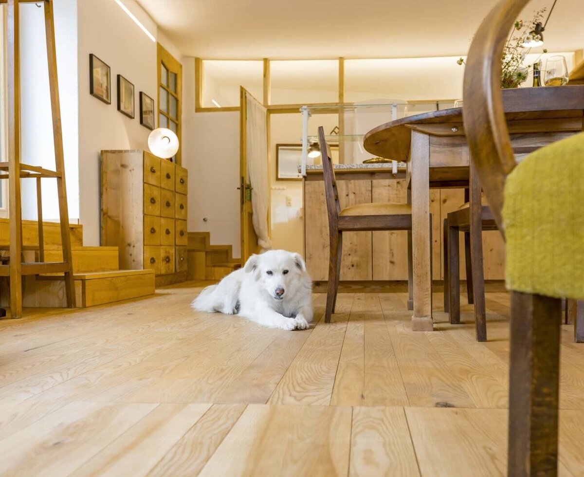 Sich selbst genug sein. Die Greisslerei ist genau der richtige Platz dafür. Fürs Ankommen. Runterkommen. Barfuß-Gehen am echten Eschen-Boden. Das Holz stammt aus unserem Wald. Selbst verarbeitet, wie so viele Dinge hier. Etliche Möbel sind noch aus der Zeit, in der die Greisslerei wirklich Greisslerei war. Schicht für Schicht ökologisch restauriert von unserer Familie. Ein Platz, der so tickt wie der Wagram. Mit Bedacht und Blick aufs Ganze.