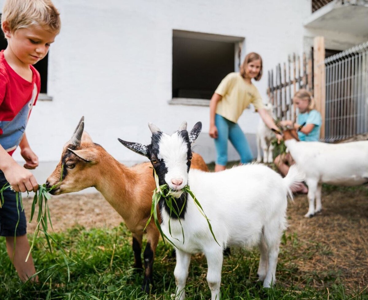 Alle unsere Tiere dürfen tagsüber jederzeit von den Gästen besucht und gestreichelt werden – Kühe, Kälber, Ziegen, Katzen und Hasen warten auf dich. -