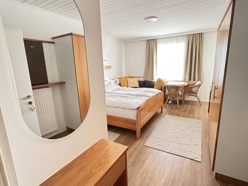 Unser kleines, feines Doppelzimmer 3 mit dem grünen Herzerl am Schlüsselanhänger ist ein helles, komfortables Zimmer zum Wohlfühlen. Ein Qween-Size Bett, ein Tisch mit Sessel und 2 weitere gemütliche Sitzggelegenheiten und ein begehbarer Schrank mit viel Platz für Garderobe und Gepäck sorgen für eine harmonische Atmosphäre.