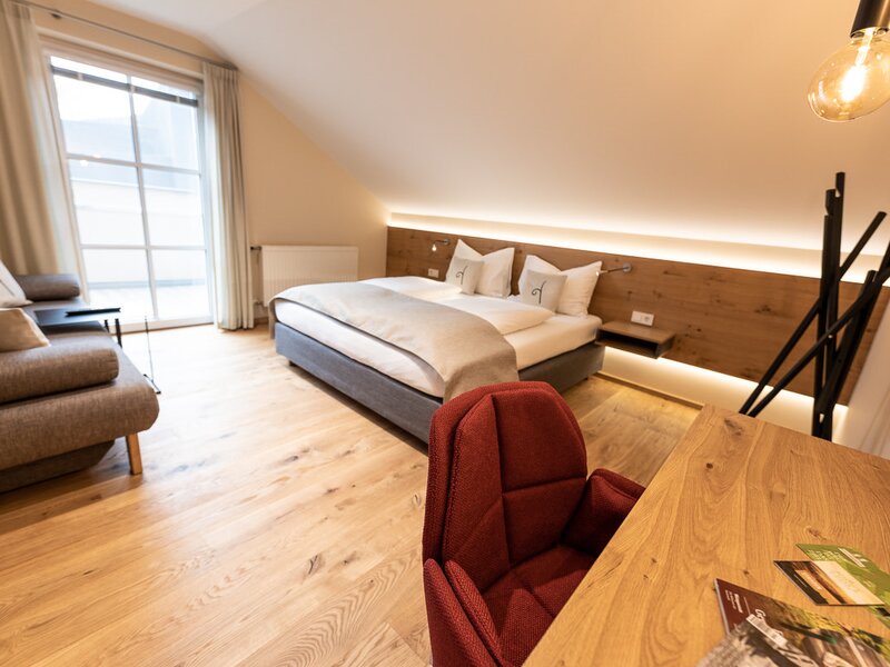 Erleben Sie erholsame Tage in unserem großzügigen Familienzimmer, gelegen im charmanten Nebengebäude 'Siebenschläferhaus'. Auf geräumigen 61 m² bietet es Platz für die ganze Familie und ist ebenerdig erreichbar. Es verfügt über einen separaten Wohn- und Schlafbereich mit einem komfortablen Kingsize-Bett sowie ein zusätzliches Schlafzimmer mit zwei Einzelbetten – ideal für Kinder oder weitere Gäste.