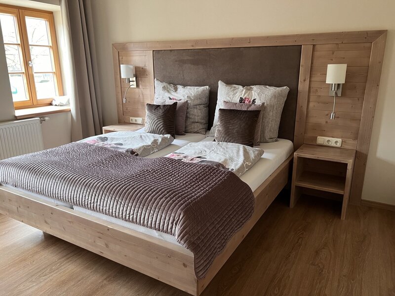 Das Doppelzimmer (Bergzeit)  ist sehr großzügig mit 25 Quadratmeter. Dieses Zimmer liegt Südseitig  mit herrlichem Blick in die grüne, schöne, ruhige Landschaft.  Das geräumige Schlafzimmer lädt sie ein für einen gemütlichen Abendausklang. Das Zimmer ist mit getrennter von der Toilette und Dusche.