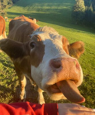 Auf unserem Bio-Bergbauernhof erwartet Sie eine lebendige Tierwelt: Hier tummeln sich unsere Kühe, neugierige Kälber, flinke Hühner, ein munteres Schwein und flauschige Hasen.