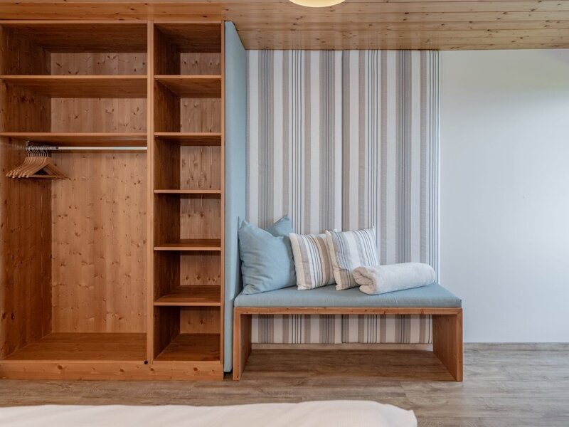 Auf ca. 65 m² erwarten Sie ein gemütliches Elternschlafzimmer mit Boxspringbett, Couch, TV und Panoramablick, ein separates Kinderzimmer mit zwei Einzelbetten und Blick auf die Pferde sowie eine voll ausgestattete Wohnküche mit Esstisch. Der Balkon mit Blick über halb Kärnten und gemütliche Bad runden das Wohnerlebnis perfekt ab.
