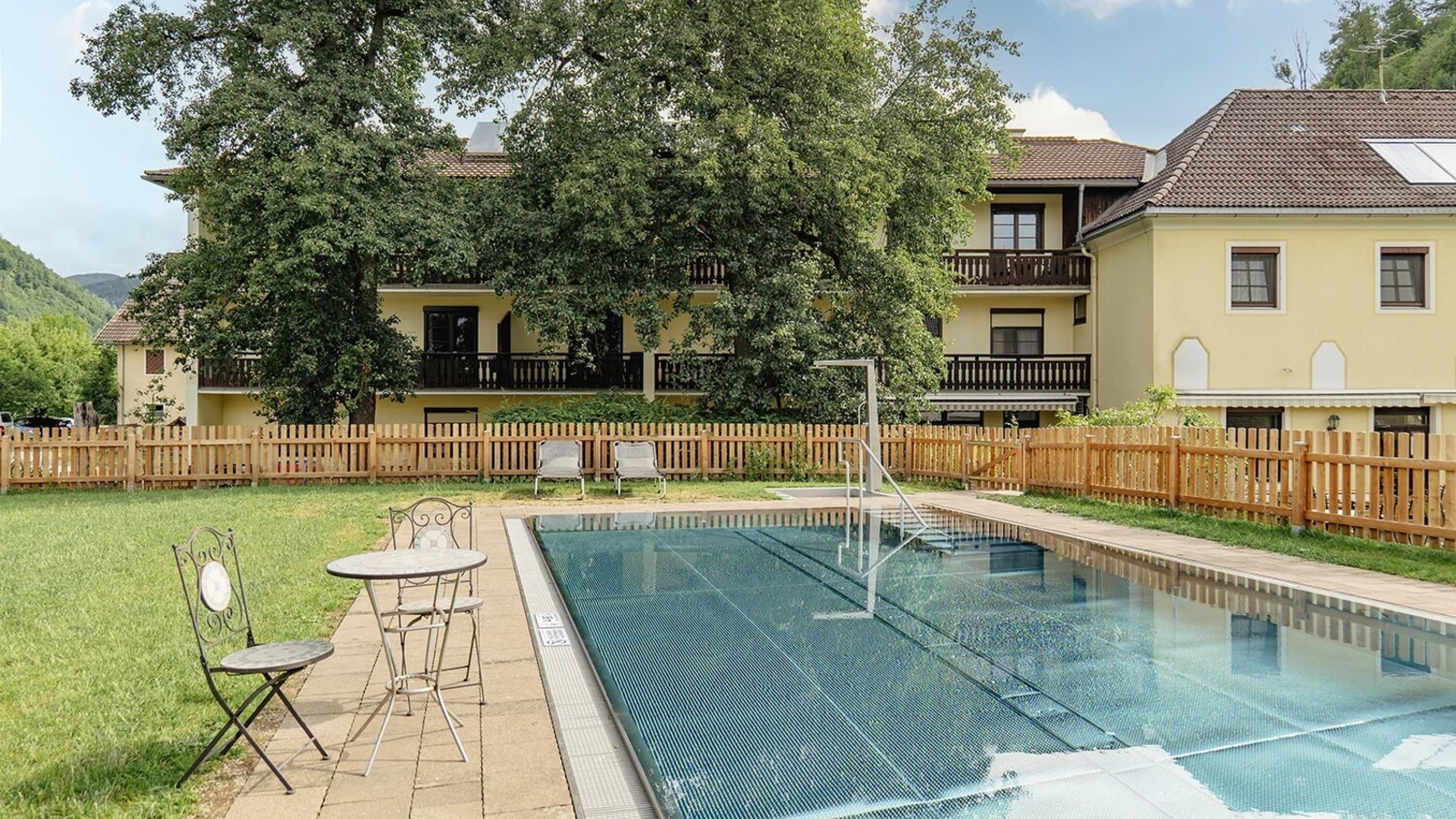 In unseren Familienzimmern blicken Sie direkt auf das Schwimmbad und in den Garten.