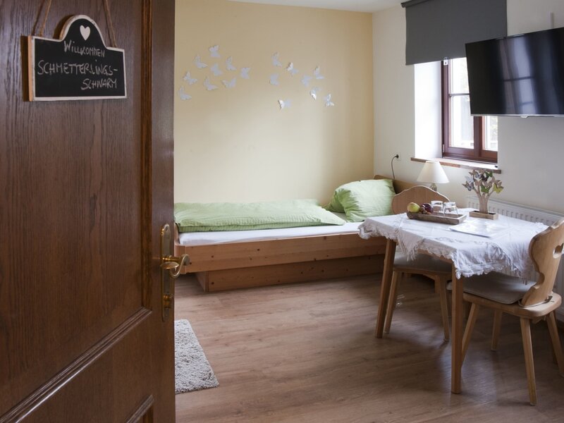 Gemütliche Ferienwohnung für 2-3 Personen im 1. Stock im Nebengebäude. Ein Doppel-/Dreibettzimmer, Wohnküche mit Couch und Sat-TV, Dusche/WC, Föhn, Vorraum.