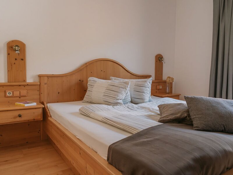 Unsere Ferienwohnung Bergglück besteht aus einem Vorraum mit Garderobe, Küche (Geschirrspüler), Badezimmer, separatem WC, einem 2. Schlafzimmer, sowie Wohn- und Esszimmer und zwei Balkonen. Der in den Hof ausgerichtete Balkon ist sehr geräumig und ist mit einem großen Esstisch ausgestattet.
