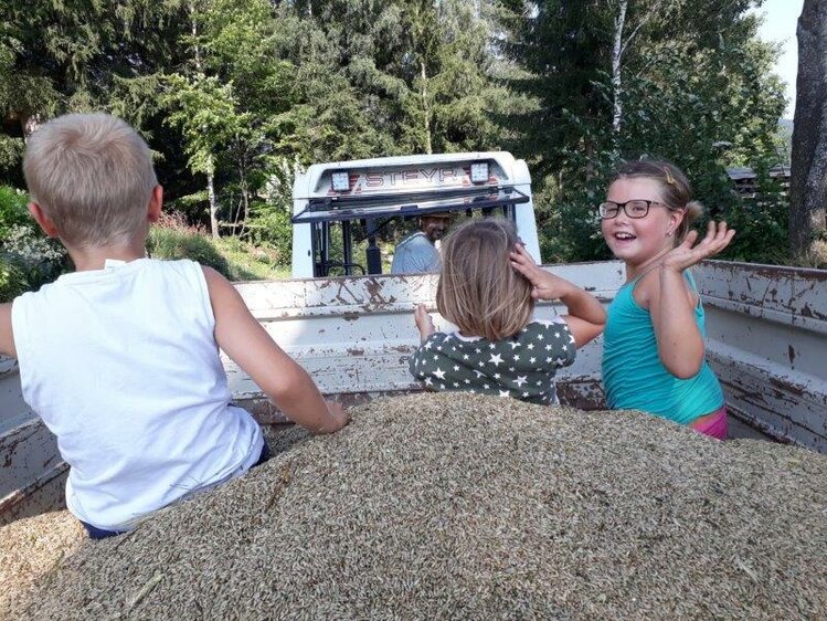 Highlight für Julia und Martin war aber eindeutig die Ankunft des Mähdreschers am Bauernhof. Die Kinder durften diesem zusehen und Bäuerin Martina zeigte in der Zwischenzeit den Kindern wie die Getreideähre vor und nach der Ernte aussieht. Bauer Jürgen brachte mit dem Traktoranhänger nicht nur das Getreide sondern auch die Kinder wieder zurück zum Hof. Und am Abend waren dann alle richtig müde...