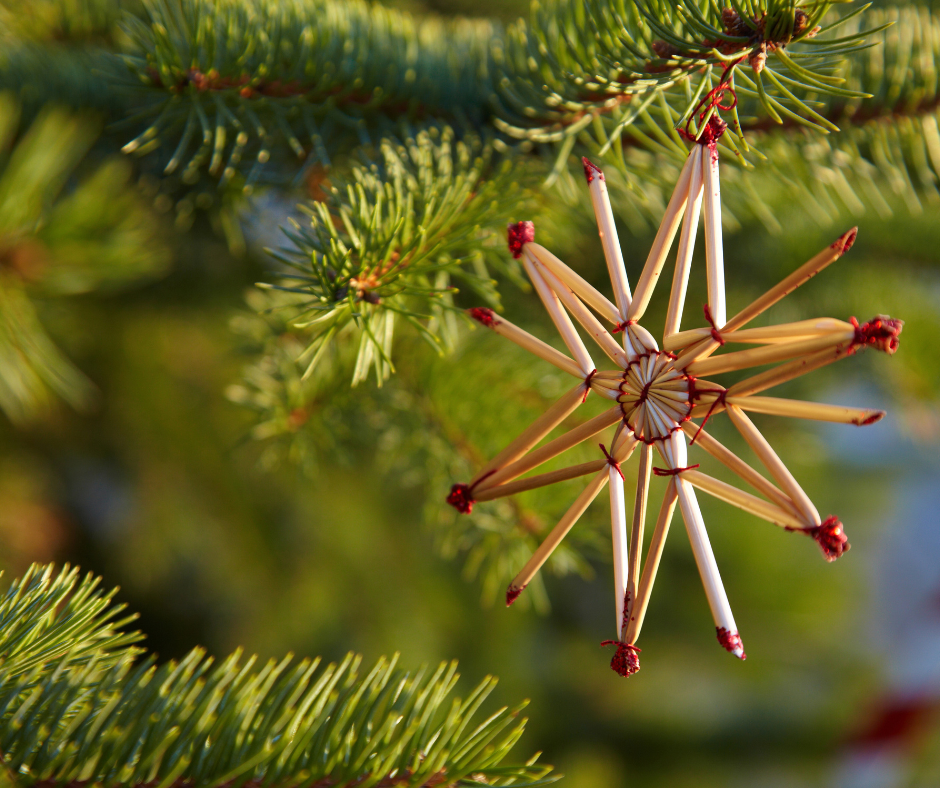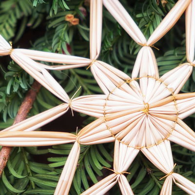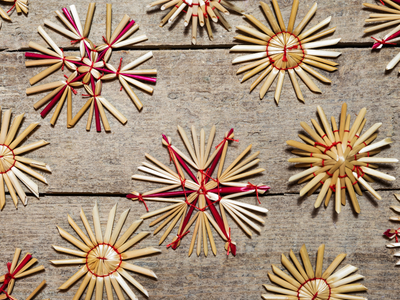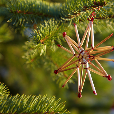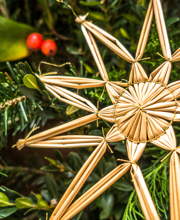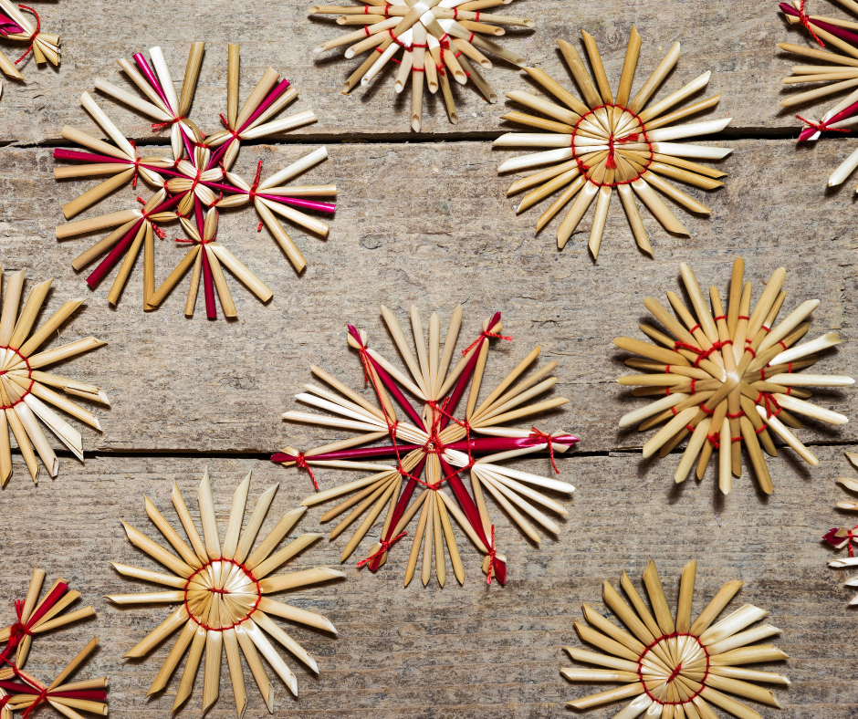 Strohornamente wie Sterne wurden als einfacher, günstiger Weihnachtsschmuck verwendet — lange bevor Glasbaumschmuck üblich war.