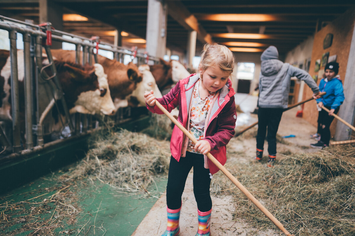 👉 Zweimal täglich ist Stallzeit: Kühe melken, Tiere füttern, Stall ausmisten. Dazwischen wird gearbeitet – im Stall, auf der Wiese oder rund ums Haus.