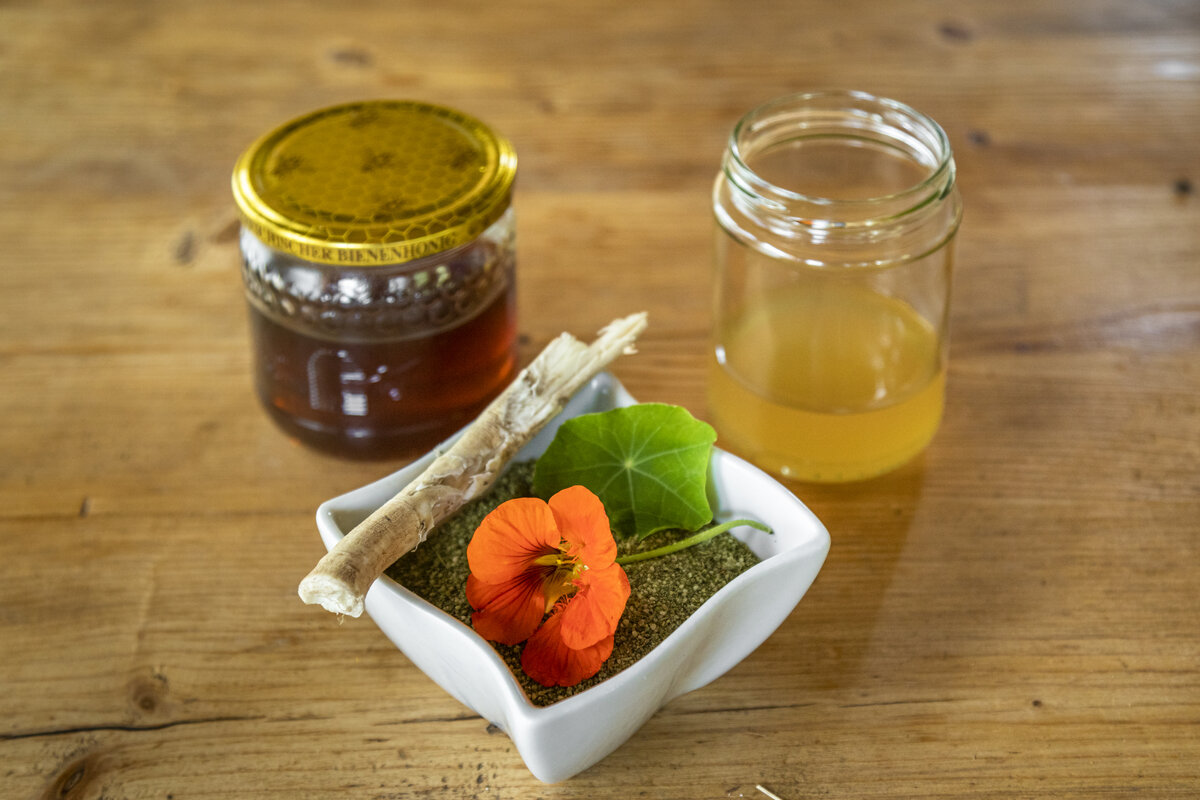 TEH – das steht für Traditionelle Europäische Heilkunde. In der Akademie wird altes, wissenschaftlich bestätigtes Wissen um die natürlichen Heilkräfte heimischer Kräuter weitergegeben. So weiß Anita mittlerweile, dass Kräuter und Pflanzenprodukte nicht nur stärken (Baldrian) sondern auch erden (Hopfen), die Stimmung heben (Johanniskraut), desinfizierend oder antiviral (Fichten- und Lärchpech) wirken können. Die feinen Mittelchen aus der Natur sind dabei keine Hexerei, sondern bestehen aus wenigen, dafür umso wirkungsvolleren Zutaten. So auch eines von Anitas Lieblingsheilmitteln, das Bauernantibiotikum: Kapuzinerkresse, Kren und etwas Schnaps, mehr braucht es nicht, um Erkältungen, Nebenhöhlen- oder auch Blasenentzündungen vorzubeugen. „Essentiell sind die in den feinen Blättern und Blüten der Kapuzinerkresse enthaltenen Senföle und die Scharfstoffe, die im Kren stecken“, erklärt Anita. Um diese herauszulösen, braucht es etwas ebenso scharfes – hochprozentigen Schnaps nämlich. Hans, Anita's Mann, brennt ihn selbst, die Äpfel kommen direkt aus dem Streuobstgarten.